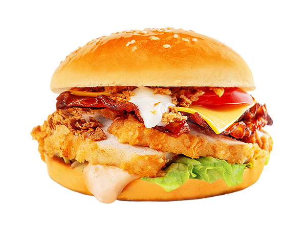 Большая булочка с кунжутомкуриное филе фрибеконсалатпомидорлук фрисыр Хохландсоус.