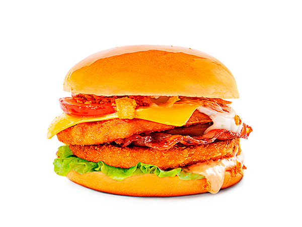 Булочкакуриная котлета 2шт.беконсалатпомидорсыр Хохландсоус.