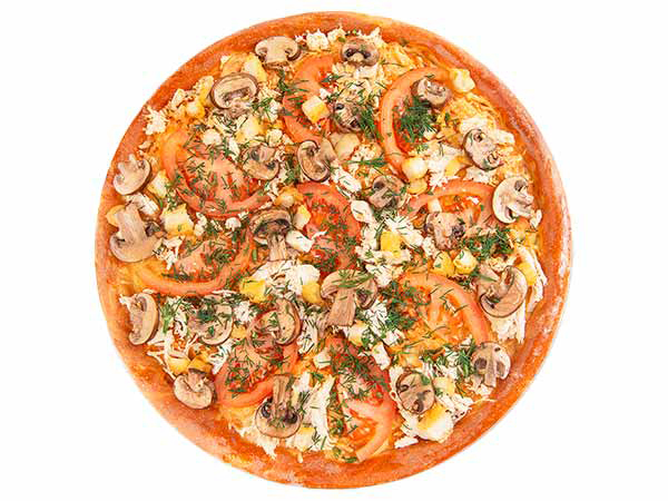 Тесто для пиццыбеконкуриное филе фришампиньоныпомидорпродукт Российскийпродукт Моцарелласоусзелень